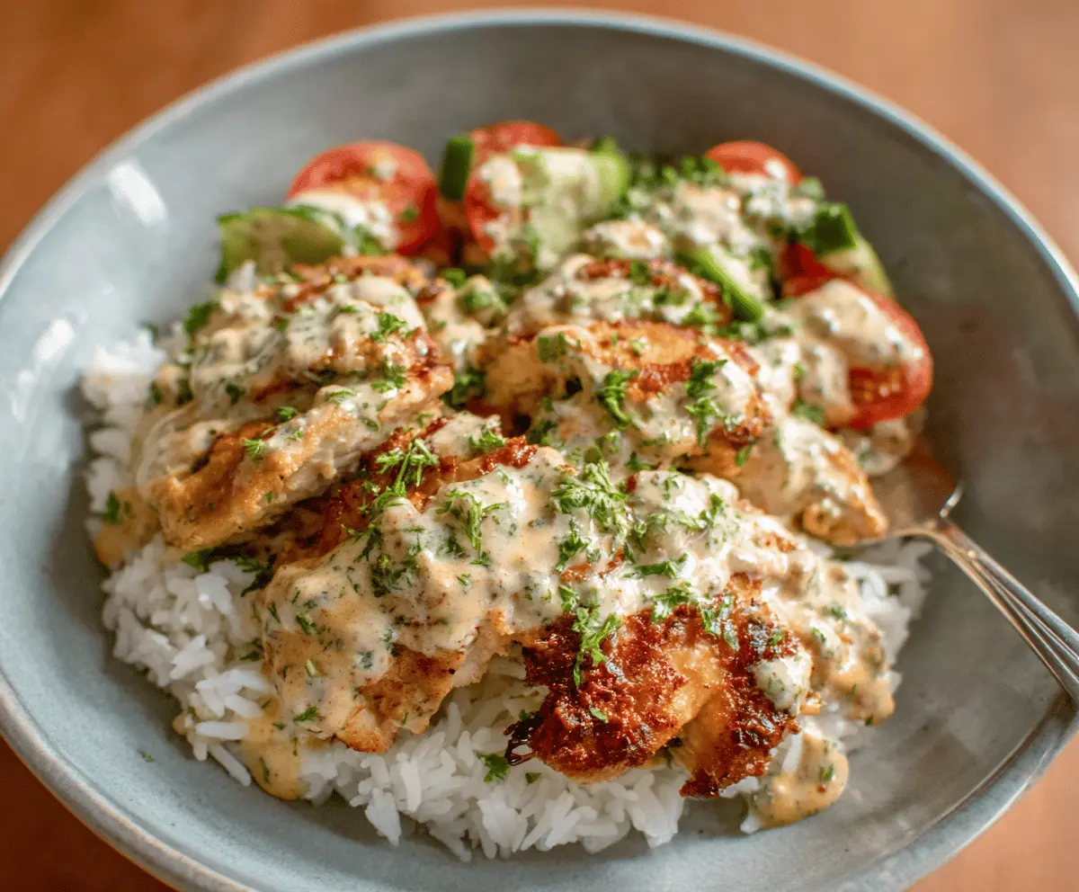 Chicken and Rice Bowls with Creamy Garlic Sauce are a simple and satisfying meal that brings together tender, juicy chicken and fluffy rice, all topped with a luscious garlic sauce that’s smooth and full of flavor. The creamy garlic sauce really makes this dish special by adding a rich, comforting touch that ties everything together beautifully.