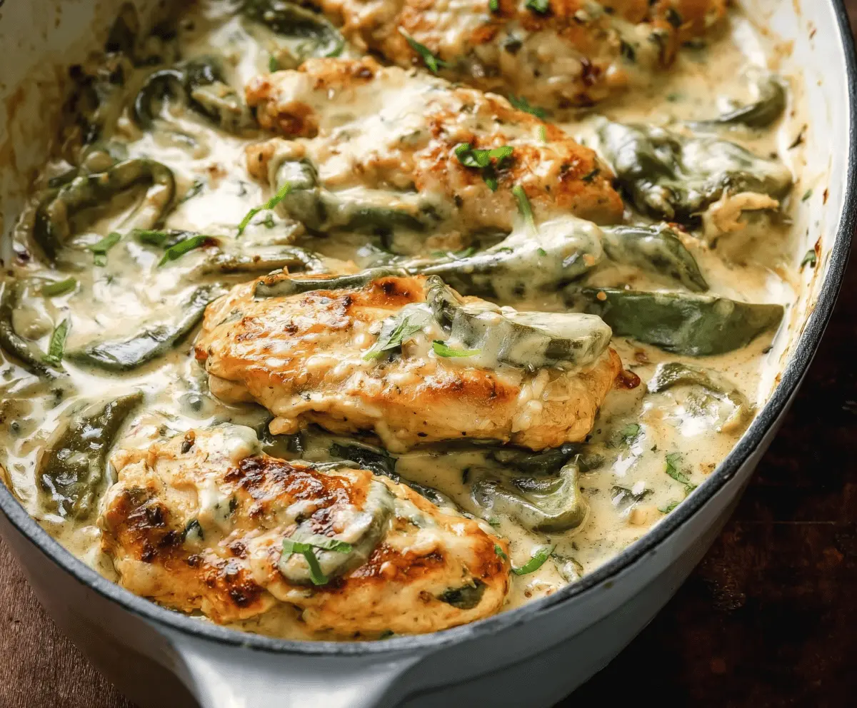 Mix in the sliced roasted poblano peppers and chopped spinach into the sauce. Cook until the spinach wilts, about 2 minutes. Season with salt and pepper to taste. Nestle the chicken pieces back into the sauce, spooning some sauce over them. Cover and simmer on low heat for 10-15 minutes, or until the chicken is cooked through and the sauce is nice and creamy.