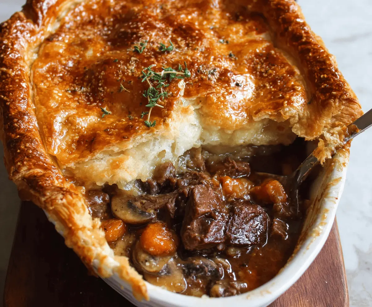This hearty pie takes about 30 minutes to prepare and brown the ingredients, then 1.5 to 2 hours simmering for tender, flavorful beef. After assembling the pie, bake it for 25-30 minutes until the puff pastry is golden and crisp. Allow 5-10 minutes to rest before serving.