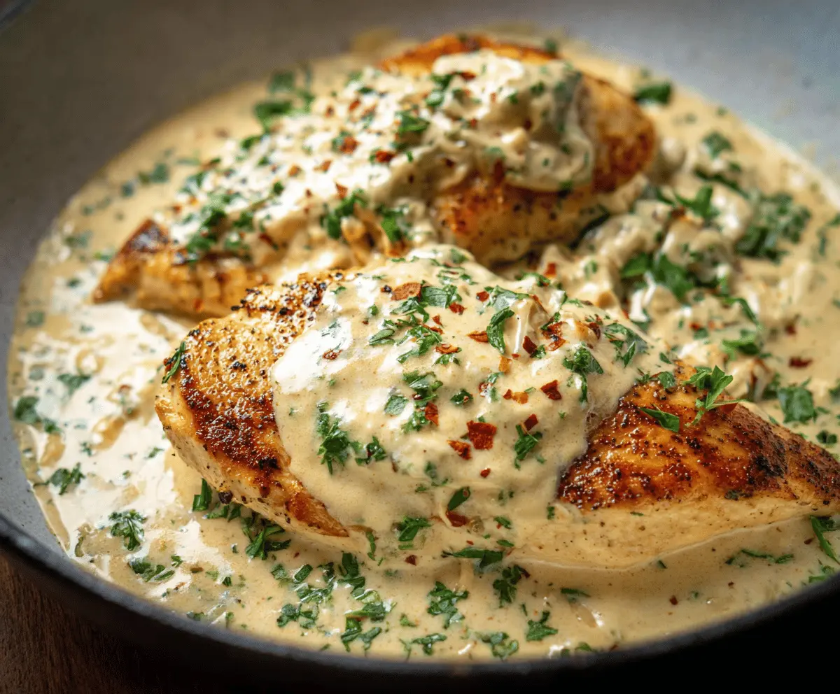 Put the chicken breasts back into the skillet. Spoon the creamy sauce over them. Let everything simmer gently for about 3 to 5 minutes so the chicken warms up and absorbs the delicious flavors.
