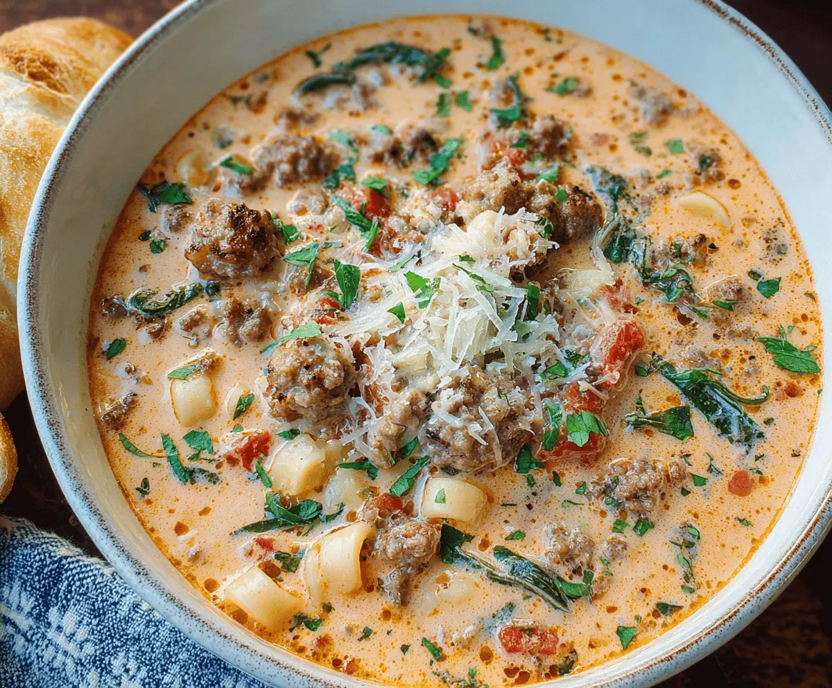 Creamy Parmesan Italian Sausage Soup with savory sausage, fresh herbs, and melted cheese served in a bowl