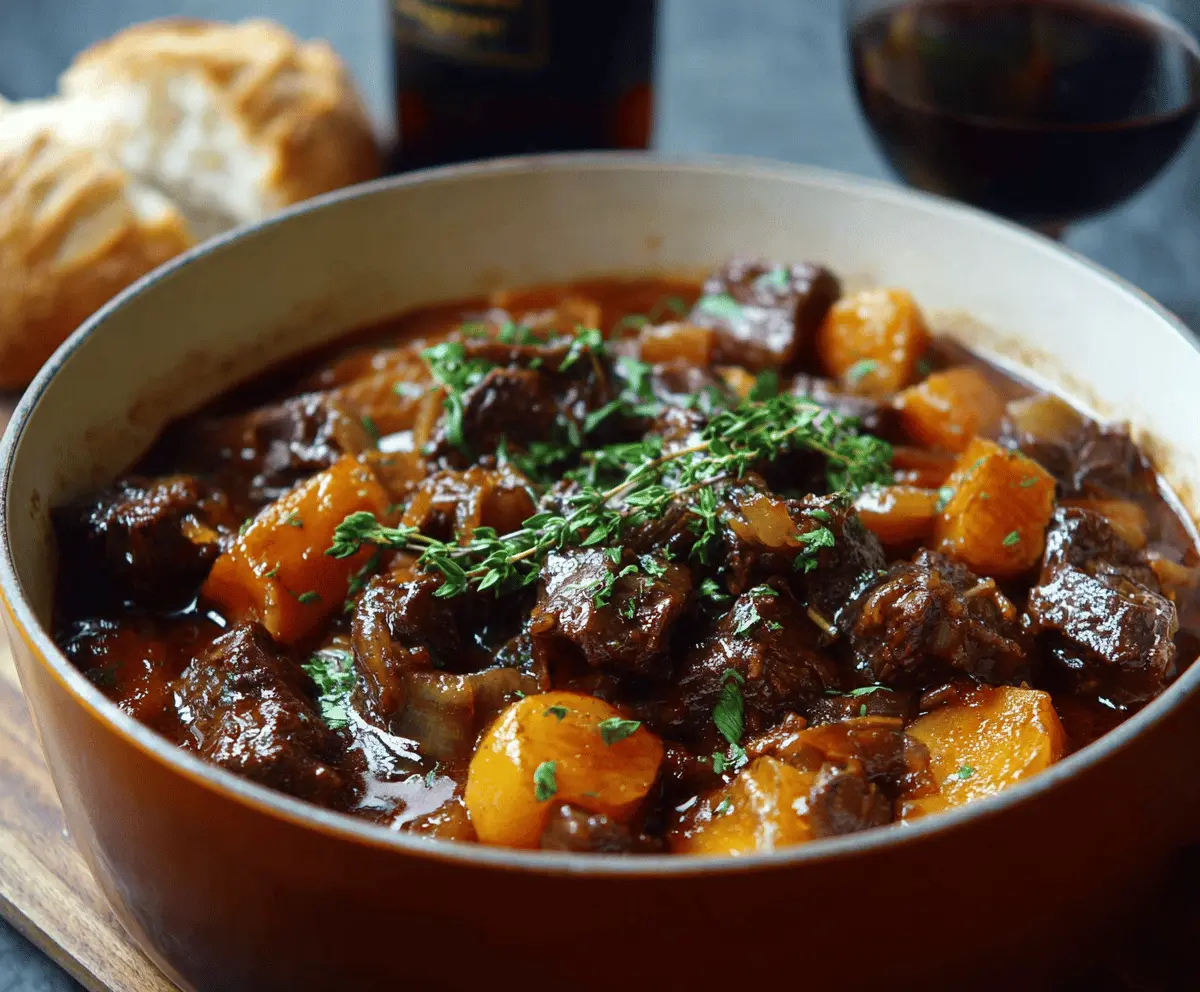 Remove the bay leaf and thyme sprigs. Taste and adjust salt and pepper as needed. Ladle the stew into bowls and garnish with fresh thyme and chopped parsley. Serve with crusty baguette to soak up every bit of that rich, red wine sauce.