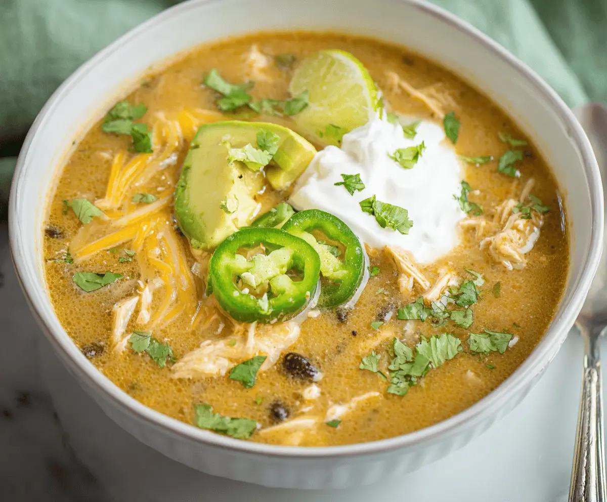 Pour the soup into bowls and add your favorite toppings like avocado slices, extra cheese, a dollop of sour cream, lime wedges, and sprinkle chopped cilantro for freshness. Enjoy your comforting Green Enchilada Chicken Soup!
