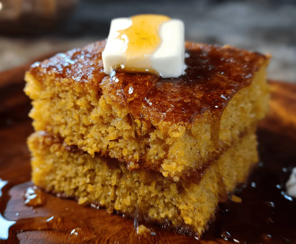 Delicious Honey Butter Sweet Potato Cornbread topped with honey butter, served on a rustic plate, perfect for comfort food lovers