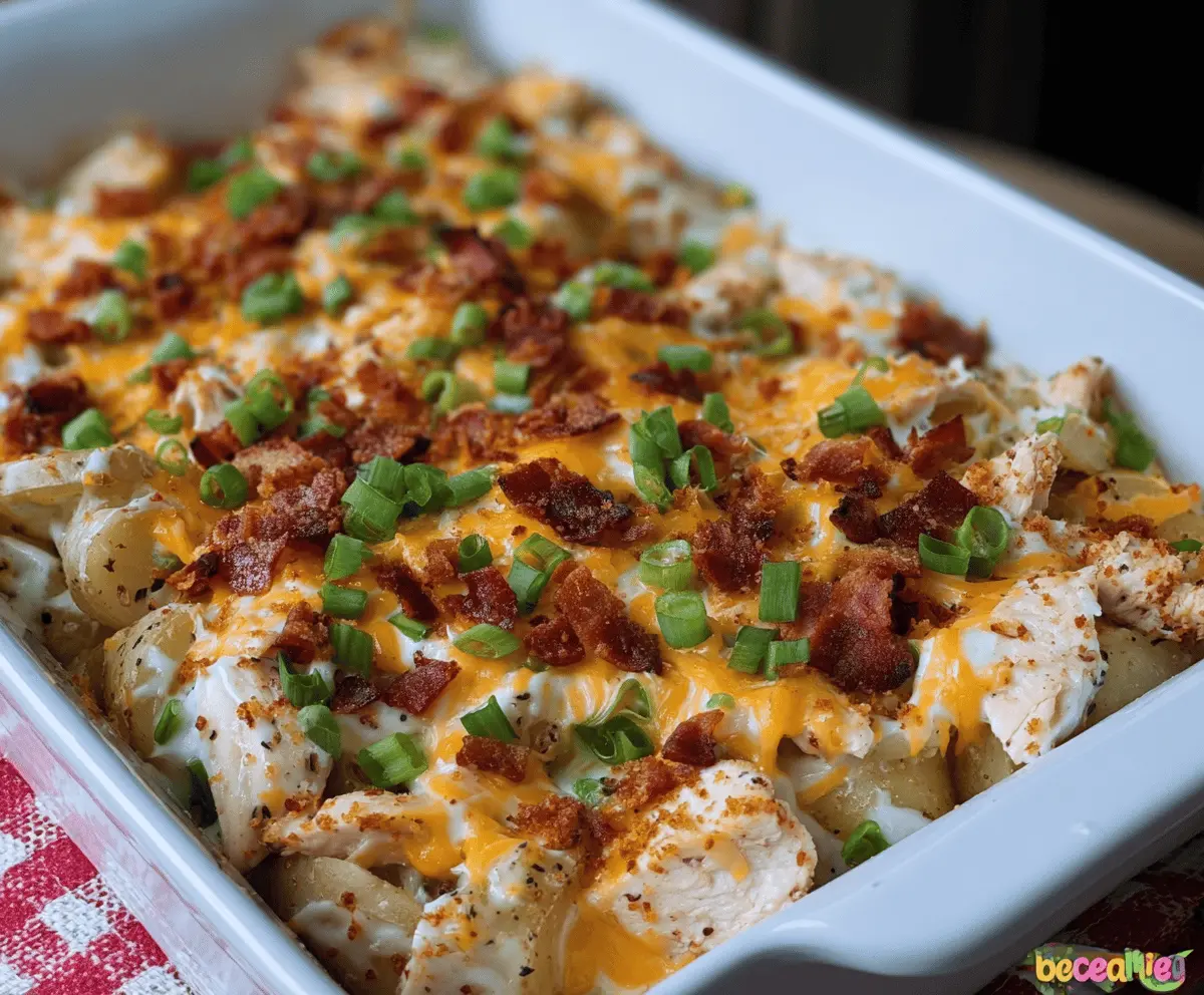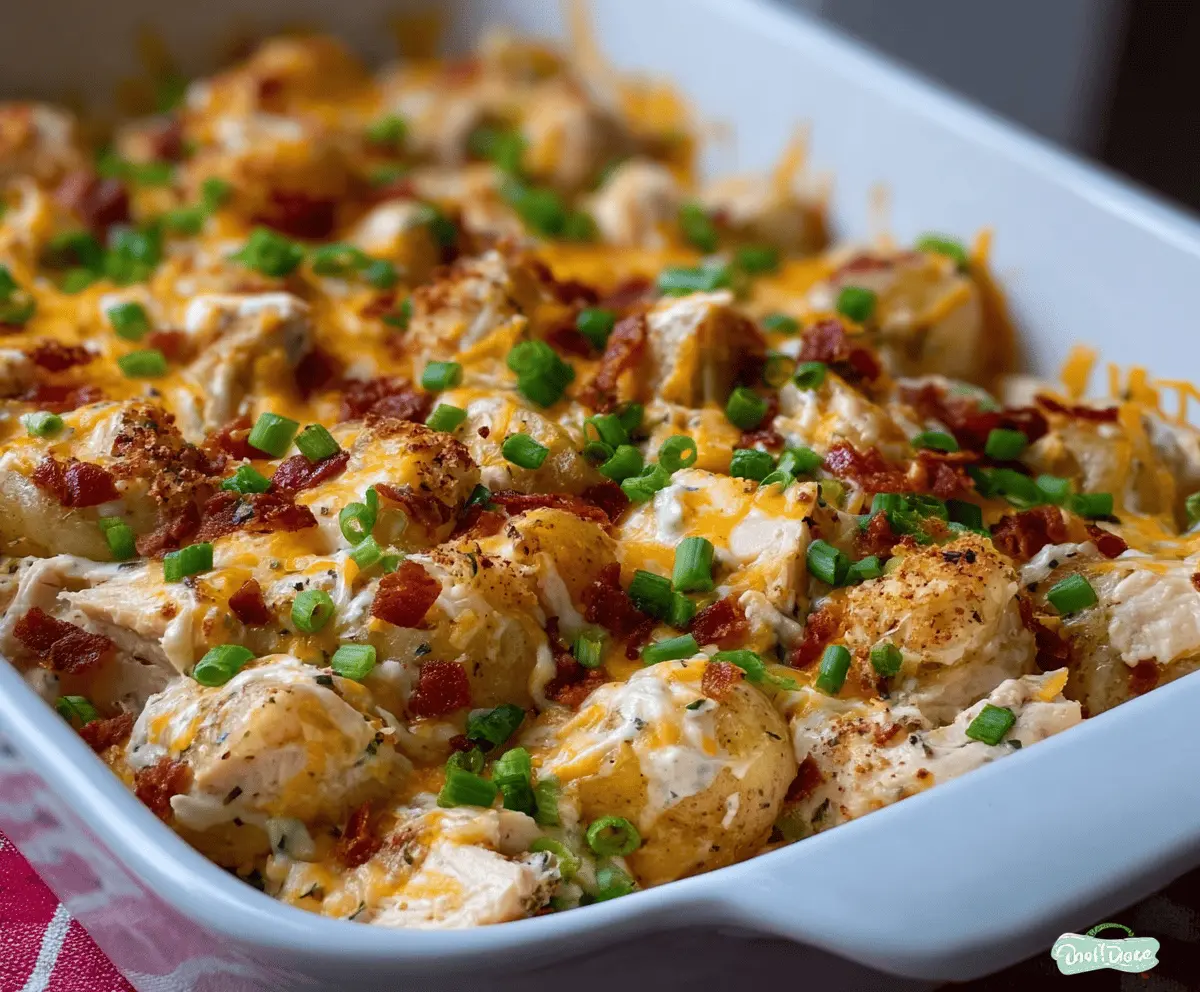Loaded Potato Ranch Chicken Casserole is a hearty, comforting dish that brings together tender chicken, creamy potatoes, and a zesty ranch twist. This casserole is packed with all the good stuff—melty cheese, crispy bacon bits, and a crunchy topping that makes every bite satisfying and flavorful.