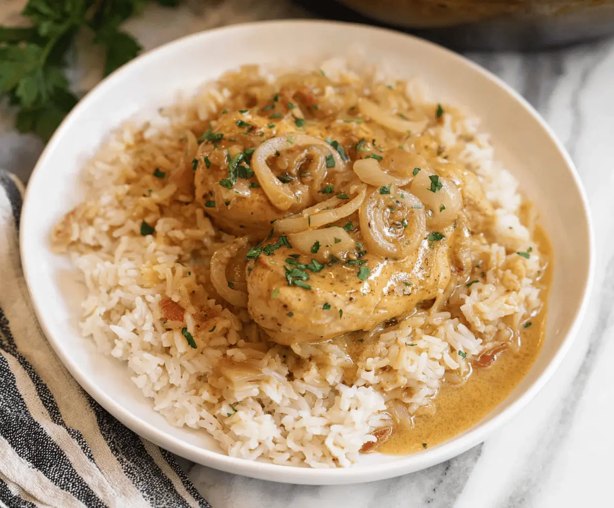 Taste the gravy and adjust seasoning if needed. Plate the cooked rice, then place the smothered chicken and onions on top. Sprinkle fresh chopped parsley for color and a touch of freshness. Serve right away with your favorite steamed veggies or a crisp side salad.